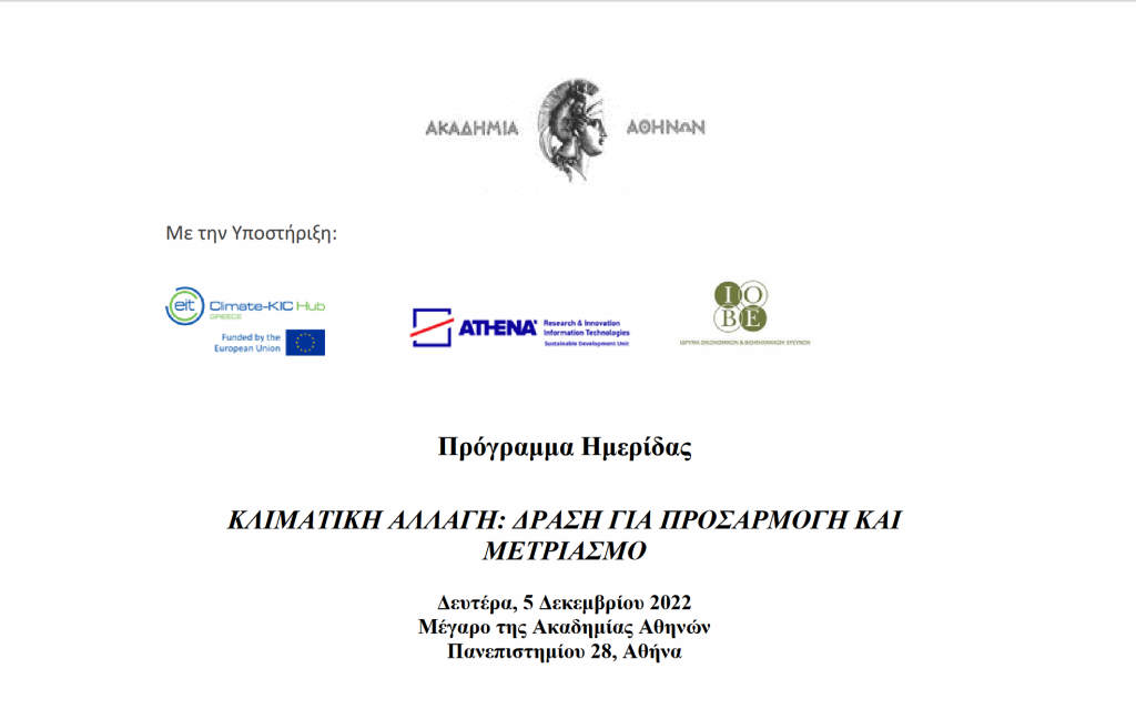 Η ημερίδα διοργανώνεται από την Ακαδημία Αθηνών με την υποστήριξη του Ελληνικού Κόμβου της Κοινότητας Γνώσης και Καινοτομίας για το Κλίμα (Climate-KIC Hub Greece), του Ερευνητικού Κέντρου ΑΘΗΝΑ και του Ιδρύματος Οικονομικών & Βιομηχανικών Ερευνών.