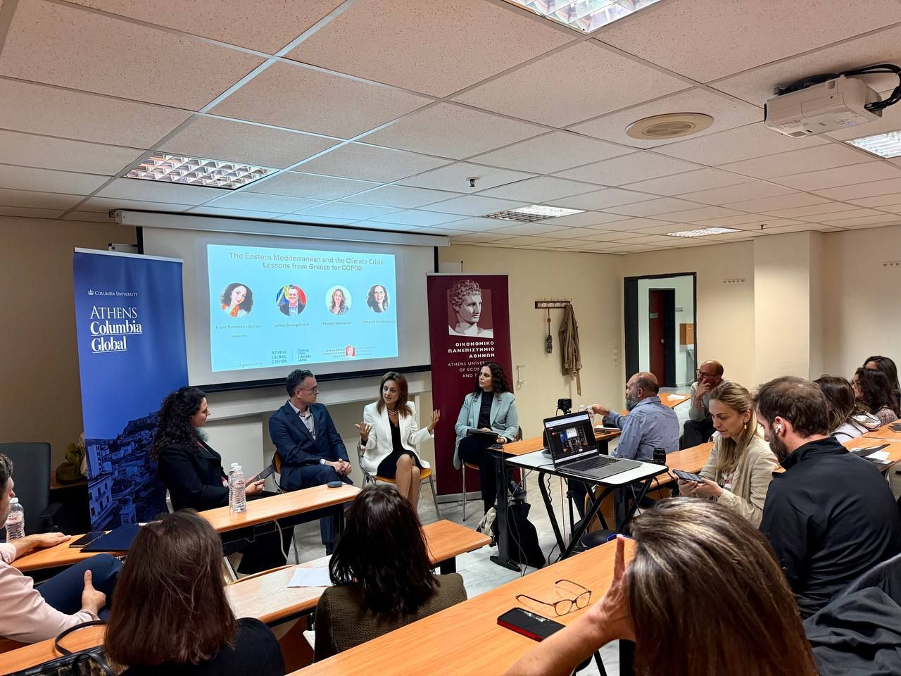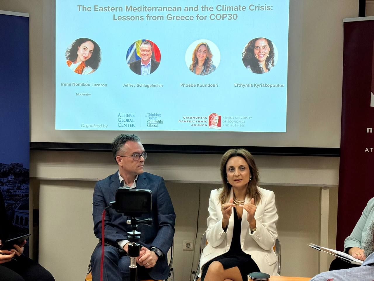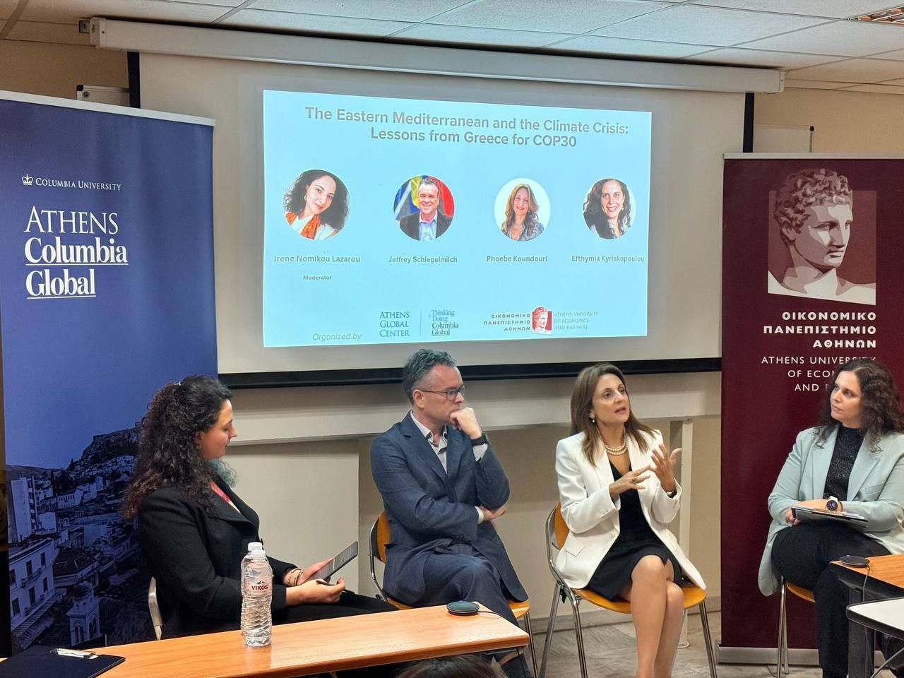 On 21 October 2025, Prof. Phoebe Koundouri participated in a distinguished panel discussion titled “The Eastern Mediterranean & the Climate Crisis: Lessons from Greece for COP30”, held at the Columbia Global Center in Athens, Greece. The event was organized by Columbia Global Center Athens in collaboration with Columbia Global, as part of the “Road to COP30: Local Voices, Global Pathways” series, which highlights regional perspectives on climate action leading up to COP30.