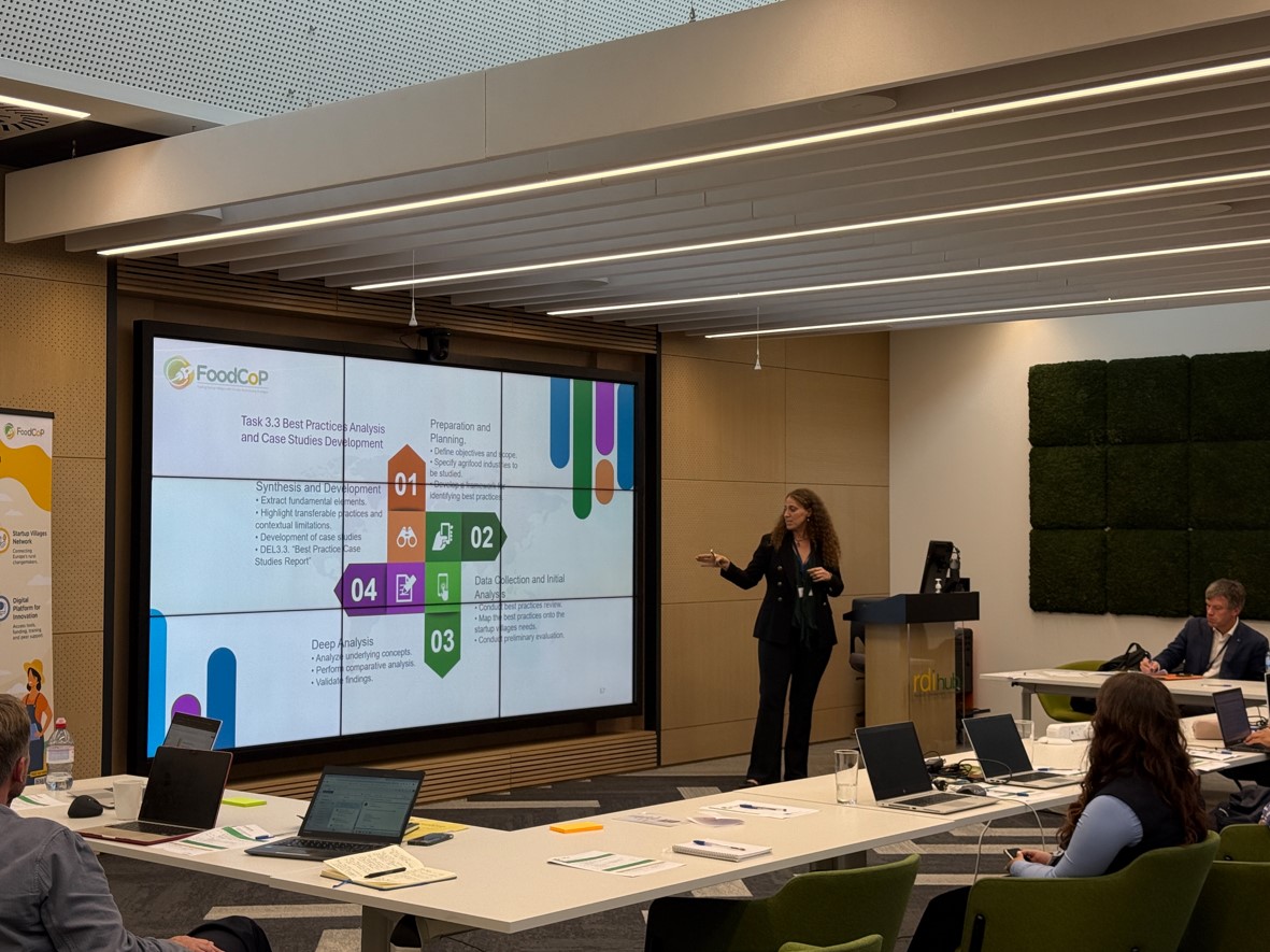 A particular highlight was the contribution of Ms. Lydia Papadaki (Sustainable Development Unit – ATHENA RC), under the leadership of Professor Dr. Phoebe Koundouri (ATHENA RC, Principal Investigator). Ms. Papadaki presented the results of the Startup Villages Best Practices Report (Task 3.3) and introduced participants to the impact assessment findings and preliminary conclusions (Task 8.3). These contributions demonstrated how FoodCoP is enhancing capacity and competence in supporting Startup Villages across Europe.