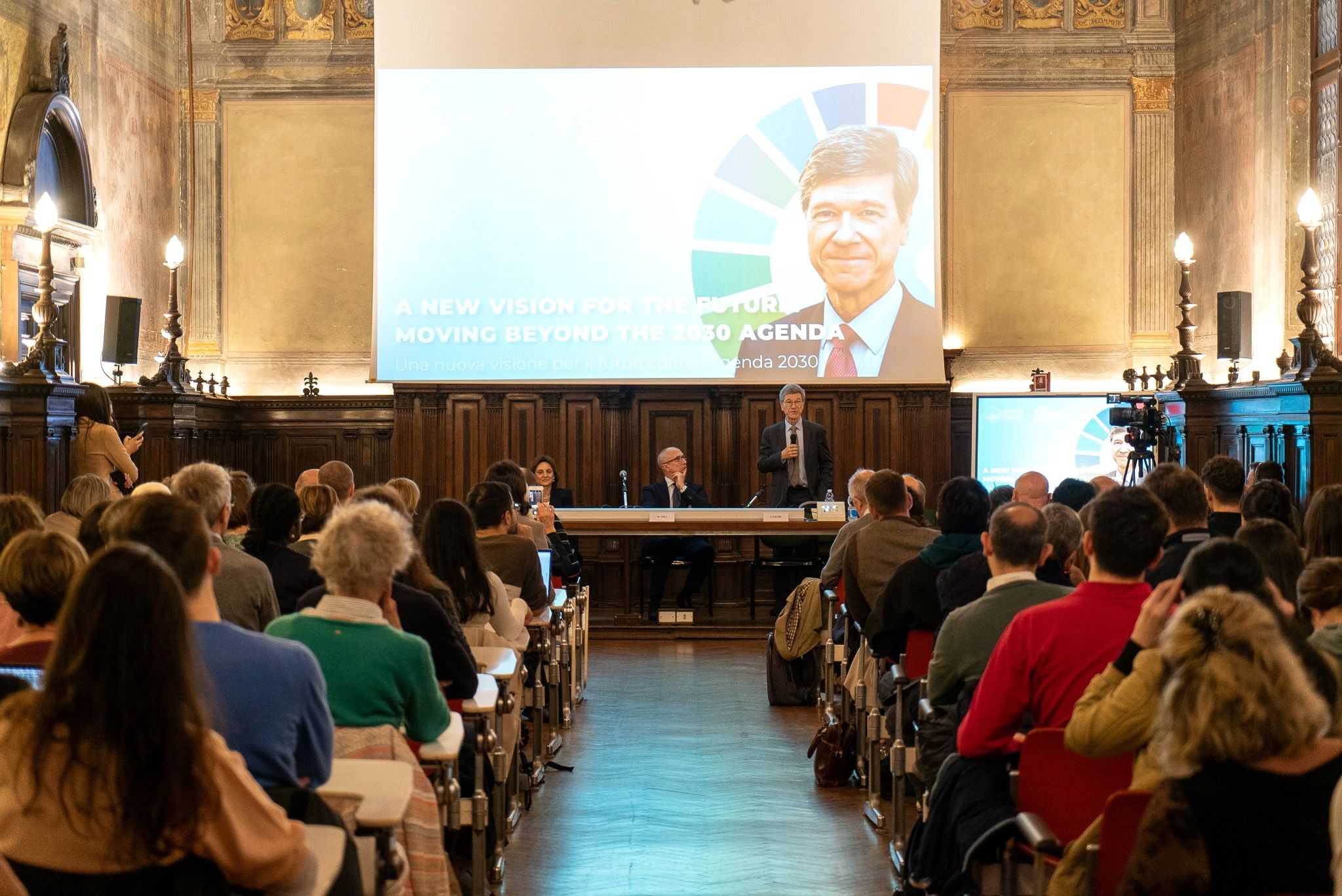 The seminar began with remarks from Prof. Francesco Castelli, Rector of the University of Brescia, and Prof. Michele Pezzagno, co-chair of SDSN Italy. Together with Prof. Jeffrey Sachs, Professor Koundouri shared insights about the #PactfortheFuture, which was endorsed by world leaders at the UN General Assembly in September in New York.