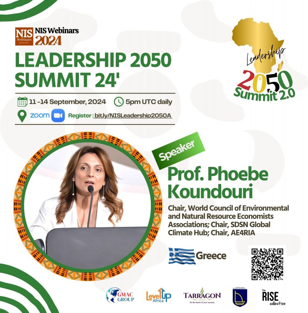 Professor Phoebe Koundouri will participate in “The Leadership 2050 Summit,” where thought leaders, industry experts, and visionaries from diverse sectors will come together to share insights, innovative ideas, and strategies for navigating the complexities of future leadership across Africa. The event is scheduled for September 11–14, 2024, and will be held online via Zoom, with live streaming on Facebook and YouTube from 5:00 p.m. to 8:00 p.m. GMT each day.